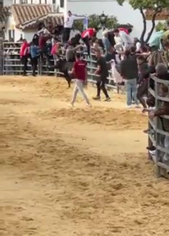 bull running loose in a fenced arena, with people both in the arena and watching from behind the fence. The arena has a sandy floor. People in the arena are running away from the bull. Many people are standing on or near the fence, watching the event. The arena is in a town. White buildings can be seen in the background. The sky is overcast.