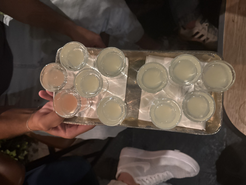 - "A high-angle, close-up image depicts a person holding a rectangular, metallic tray containing eleven shot glasses" by FM-RvH1g2, licensed under CC BY 4.0