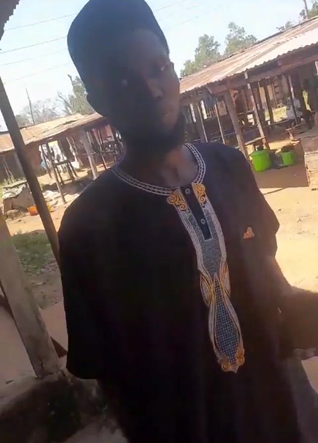 A man wearing a dark-colored dashiki and a matching skullcap stands holding a smartphone in his left hand. The camera pans right to show a cluster of open-air market stalls with corrugated metal roofing. The ground is a mix of dirt and sparse vegetation. The day appears sunny. There are visible power lines overhead.