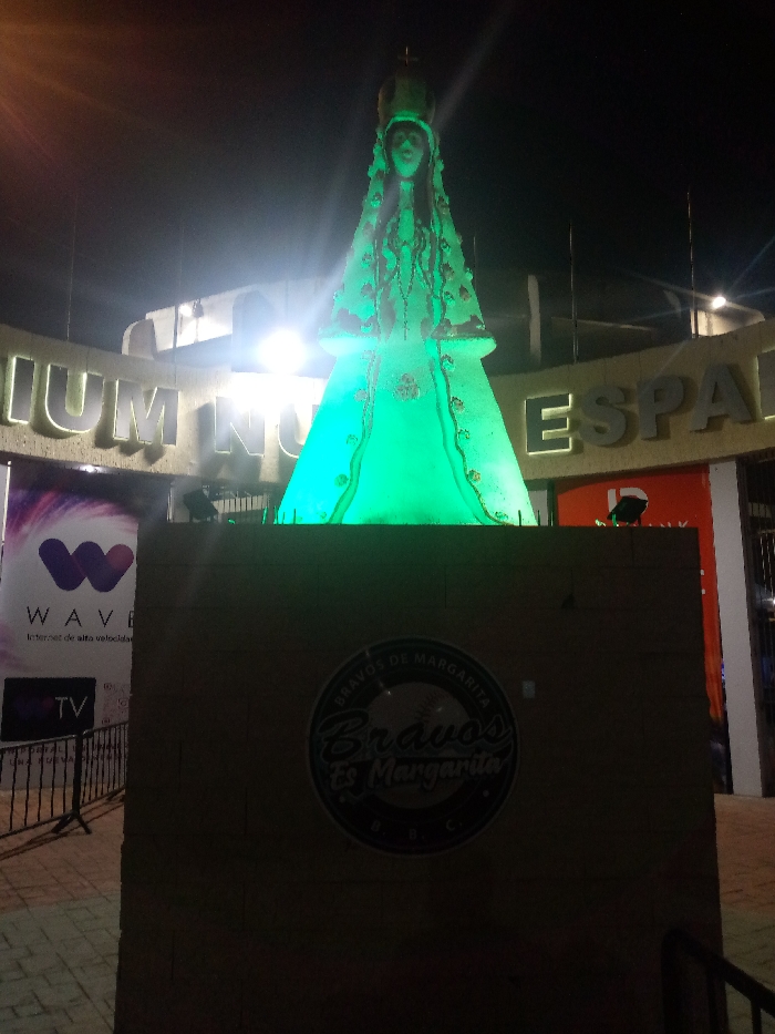 n illuminated statue of the Virgin Mary, possibly at night. The statue is lit with a bright green light. Below the statue is a stone or brick structure with a circular sign that reads "Bravos Es Margarita B.B.C." Behind the statue is a building with the words "LUMINUM ESPA" visible on its facade. To the left, there's a poster for "WAVE" internet and TV services. The overall impression is of a public space or plaza featuring religious and commercial elements.