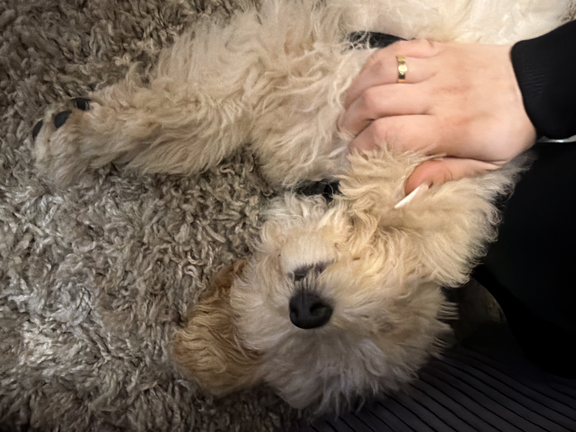 golden doodle dog lying on a gray shaggy rug. A human hand with a gold ring is petting the dog. Part of the person's black sleeve is visible. The location is unknown, and there is no indication that it is in Plovdiv, Bulgaria.