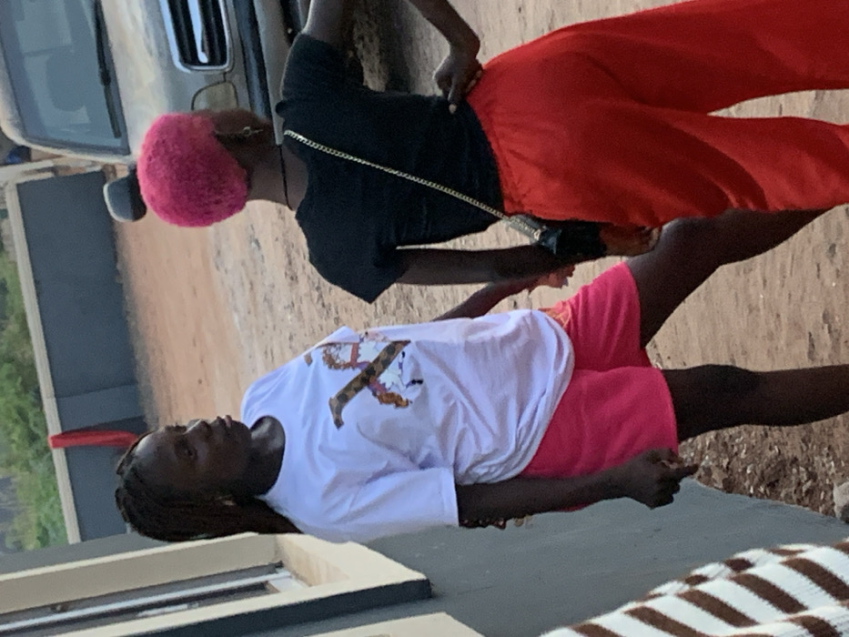 Two people are standing outside. The person in the foreground is wearing a white t-shirt with a logo and pink shorts. The person in the background has pink hair, a black shirt, and red pants. A vehicle is in the background, and a striped cushion is in the foreground.