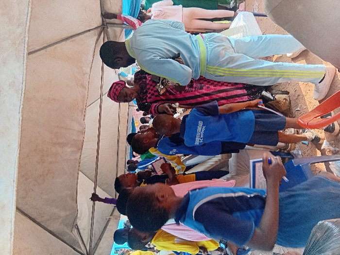 The image depicts an outdoor gathering under a large, light-colored canopy with visible metal framing. The ground is unpaved earth. Approximately 15-20 individuals are present, consisting primarily of primary school-aged children and a few adults. A central adult female, wearing a pink and black patterned long dress and matching headwrap, is smiling and extending her left hand, seemingly interacting with the children. To her right stands an adult male in a light blue long-sleeved tracksuit with lime green stripes on the pants, facing the female. Many children are dressed in blue and dark blue school uniforms; one child's uniform clearly displays "OMARFIELD STANDARD SCHOOL" on the back. Other children wear yellow or light pink tops. The children are gathered around the central adult female, with most looking in her direction. One child on the far left holds a white rectangular document, possibly a certificate, and a blue pen. Another child in the background has an arm raised. Partial views of a white table, a blue plastic chair, and a red plastic chair are visible. The specific location within Tuaniako, Nigeria, is not discernible from the image content.