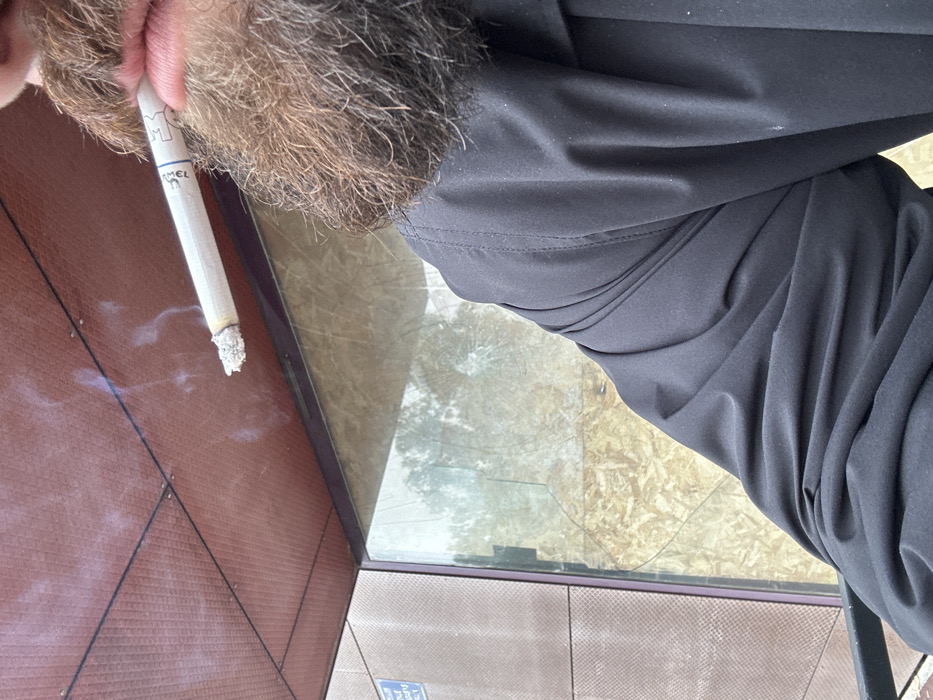 A close-up image depicts an individual with a thick, reddish-brown beard holding a lit Camel-brand cigarette between their lips. A significant ash column is present on the cigarette, and smoke is visible rising upwards. The person is wearing a black jacket. The background features a reddish-brown, textured overhead structure, possibly an awning or ceiling, secured by fasteners. Below this, a large glass pane is severely cracked with a clear circular impact point, indicating damage. Behind the shattered glass, a light-colored oriented strand board (OSB) or plywood panel is visible, suggesting a boarded-up section. To the far left, a brownish-grey textured building facade and a partially obscured blue and white sign are discernible. The scene is situated in Aubervilliers, France.