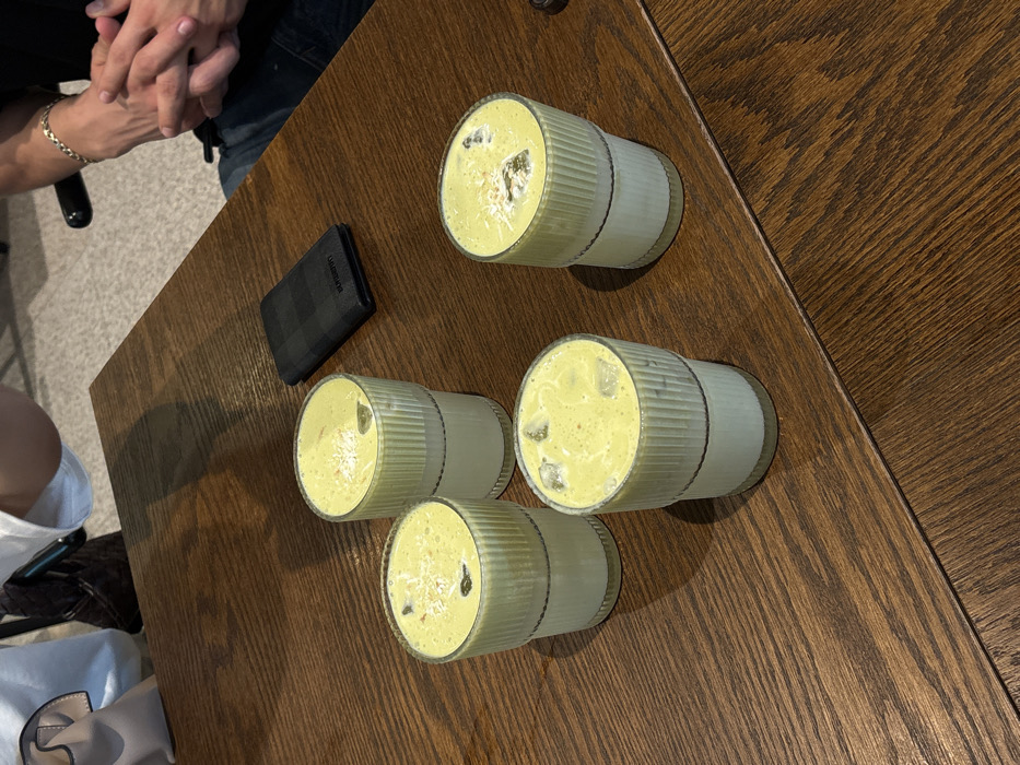 A high-angle shot showcases a dark wooden table with four glasses of pale green drinks, likely matcha lattes, with visible ice cubes. A small, black, checkered wallet sits near the glasses. A man’s hands and arm with a bracelet are visible in the upper-left corner, and a purse and light-colored clothing are in the lower-left corner, suggesting people are seated at the table. The table’s wood grain is prominent, adding texture to the scene.