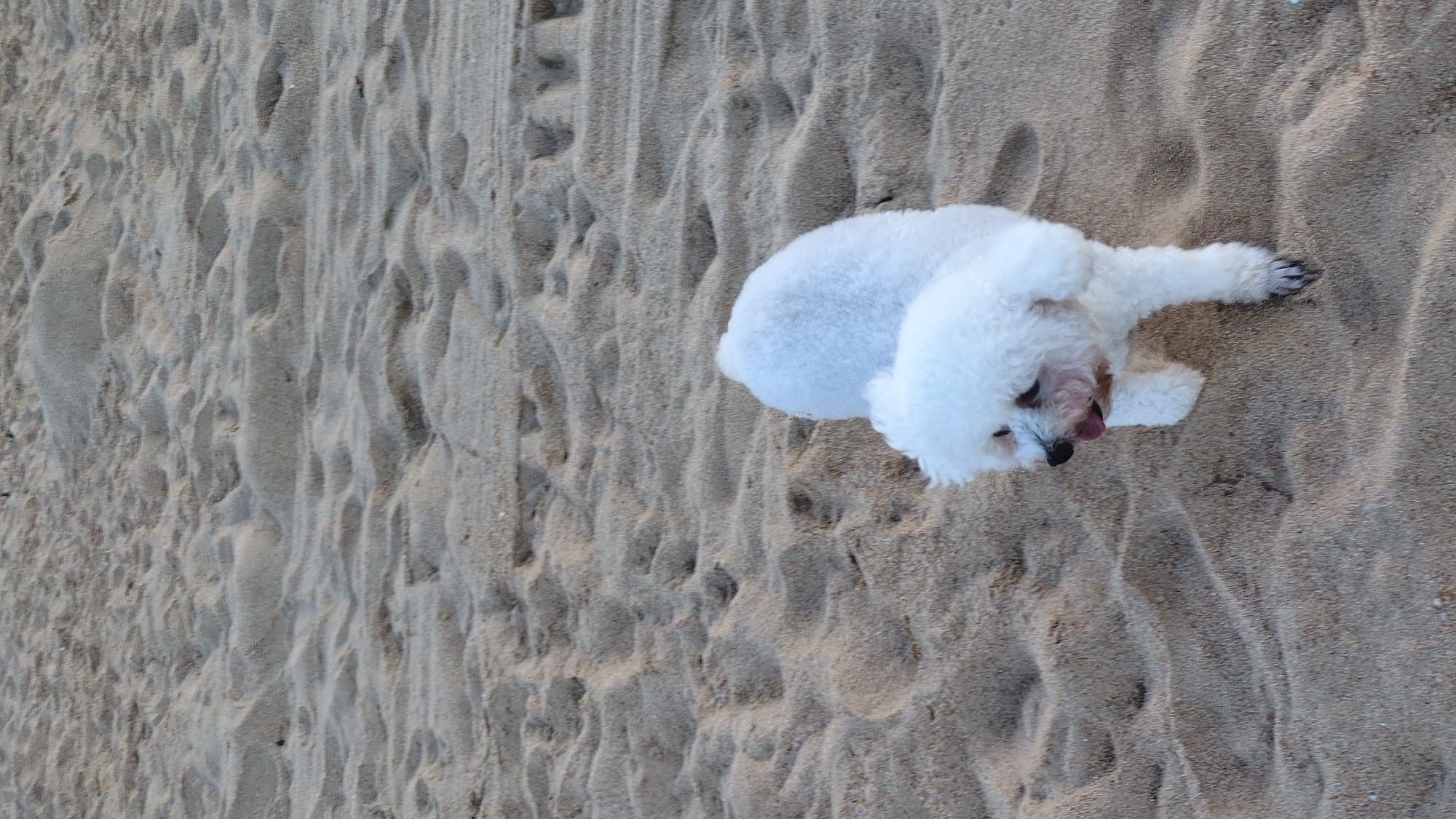 - "A small, white, fluffy dog, likely a Bichon Frise or similar breed, is lying on sandy ground" by FM-MreoF3, licensed under CC BY 4.0