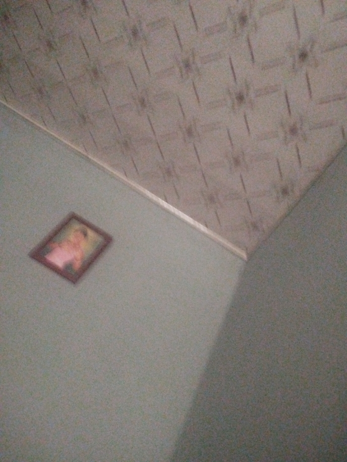 A corner of a room shows a ceiling with a patterned tile design in muted beige tones. The walls are painted in a pale green shade. A framed picture hangs on the left wall. The picture appears to contain a figure, likely a person, though details are unclear due to the distance and blur. Light and shadow create a gradient effect on the right wall.