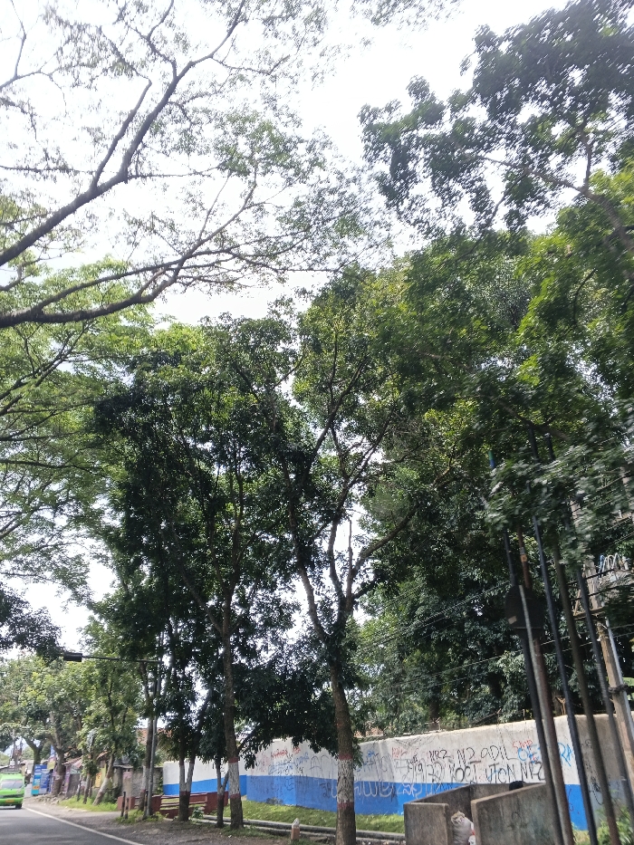 Lush trees with varying canopy densities occupy most of the frame. A street stretches along the left, with a glimpse of a green vehicle. A weathered wall adorned with graffiti forms a boundary, marked by blue and white sections. Utility poles and overhead wires stand near the wall. The sky is visible through the foliage, appearing overcast. The scene is a blend of nature and urban elements.