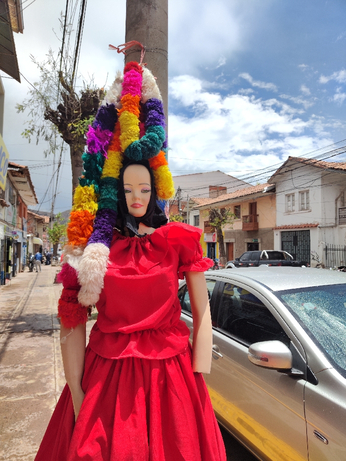 A full-body mannequin, dressed in a bright red traditional-style gown with a gathered neckline, short ruffled sleeves, and a tiered skirt, is displayed on a sidewalk in Wanchaq, Peru. The mannequin's head, detached from the body, features light skin, pinkish lips, and dark eyes, with black hair partially covered by a black fabric. A long, thick, multi-colored garland, made of various shades of fluffy yarn-like material including red, orange, yellow, green, blue, purple, and white, is draped around the mannequin's neck and head, extending upwards to be secured with red ties to a gray utility pole directly behind it. The mannequin's arms are visibly truncated at the elbows. Adjacent to the mannequin, a silver sedan is parked on the asphalt street. The background to the right consists of residential or commercial buildings with light-colored facades and terracotta-tiled roofs, some featuring balconies. To the left, a paved sidewalk extends into the distance, with more commercial buildings lining the street and several indistinct human figures walking. Overhead, a partly cloudy blue sky is visible, along with multiple utility lines and a sparse tree.