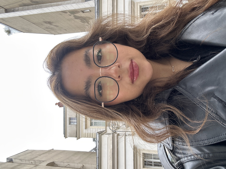 A close-up, eye-level selfie features an individual, likely female, with shoulder-length wavy light brown hair, directly facing the camera. The individual wears large, round glasses with black rims and rose gold accents, has rosy, glossy lips, and a neutral expression. They are dressed in a dark, possibly black, leather-look trench coat, and a thin gold-colored necklace with an elongated oval pendant, resembling a Messika 'Move Uno' design, is visible on their chest. The background displays typical Parisian architecture under an overcast sky. To the left, a classical light-colored stone building with ornate white window frames and a visible reddish rooftop or chimney rises. To the right, a taller, plainer light-colored stone building with a flat roof featuring some greenery is present. The scene is an outdoor urban environment within the city of Paris, France, characterized by its distinctive building styles.