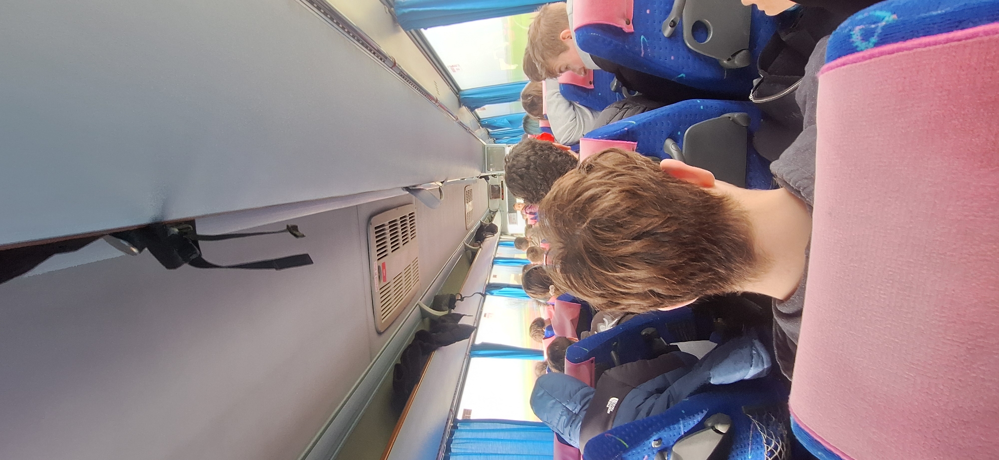 The scene depicts the interior of a passenger bus in Polsko Padarevo, Bulgaria, observed from a rear seat looking forward. Multiple individuals, predominantly adolescents or young adults, occupy the blue fabric seats, which feature pink headrest covers. The individual in the foreground has light brown, wavy hair and wears a grey garment. A passenger to the left wears a blue hooded jacket with "The North Face" branding visible on the back. Overhead, gray luggage compartments line both sides, holding some dark items. Rectangular air vents are installed in the light grey ceiling, one of which bears a red warning label. Blue curtains partially obscure the windows, revealing a blurred external environment of daylight and green vegetation, indicative of travel through a rural or open landscape. Dark straps or cables hang from the ceiling in the forward section of the bus. All visible passengers are seated and oriented forward, consistent with transit.