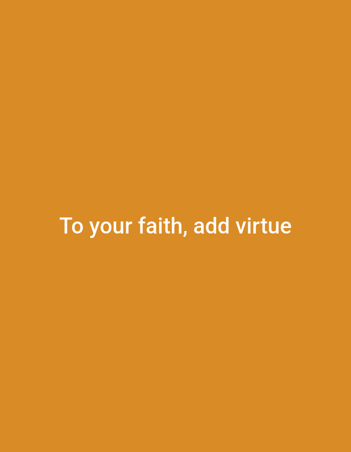 The image displays a solid, uniform orange background. Centered horizontally in the lower portion of the frame is white, sans-serif text that reads: "To your faith, add virtue". No other objects, subjects, people, actions, or interactions are present. The environment is an undifferentiated digital color field. Location is Unknown, Unknown.