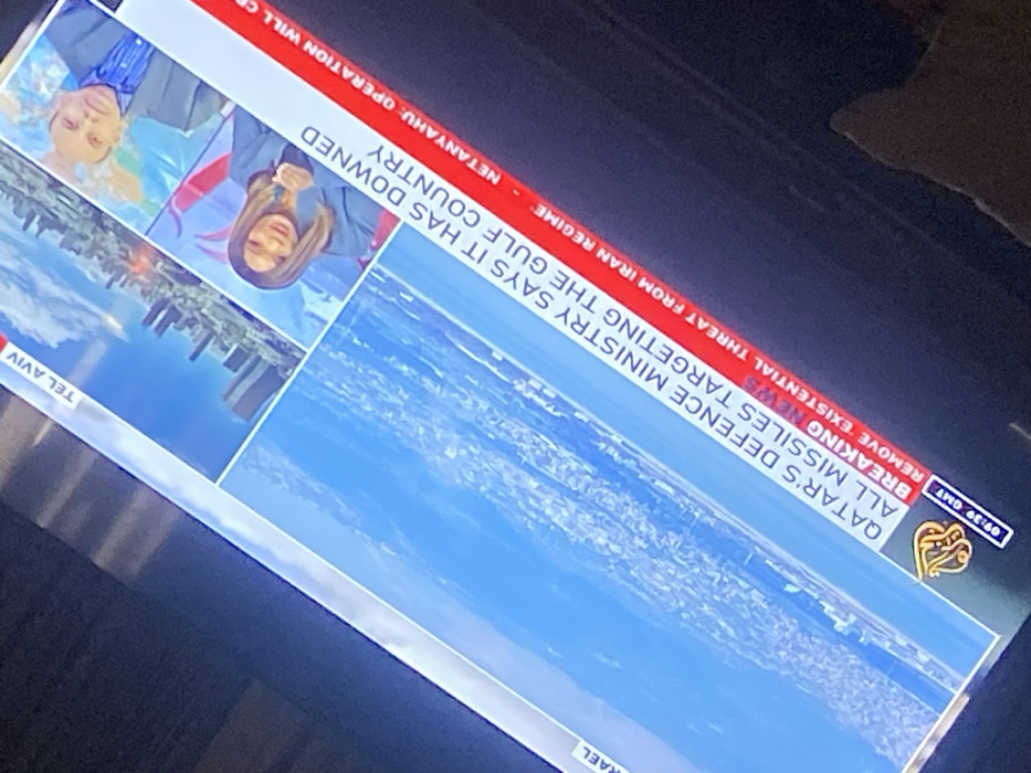 A photograph captures a tilted, illuminated television screen displaying a news broadcast in a dark room. The specific location in Narayi, Nigeria, is not determinable from the image. The screen features a split layout: - The upper right segment shows two individuals: an older man with light skin, wearing a blue shirt and grey jacket, exhibiting a serious expression, and a younger woman with medium-toned skin, dark hair, wearing a dark blazer, smiling slightly. - The larger left segment displays an aerial view of a coastal cityscape under a bright blue sky with scattered clouds, labeled "TEL AVIV" at the top. Below this, a golden emblem and the time "09:39 GMT" are visible. - A prominent red news ticker runs across the bottom, displaying scrolling white text including: "QATAR'S DEFENCE MINISTRY SAYS IT HAS DOWNED ALL MISSILES TARGETING THE GULF COUNTRY," "BREAKING NEWS," and "NETANYAHU: OPERATION WILL CE[ASE]... REMOVE EXISTENTIAL THREAT FROM IRAN REGIME" (partially visible). The immediate environment around the TV is dark, with reflections visible on the screen's left edge. A light-colored, soft object is partially visible in the bottom right corner of the frame, possibly fabric or furniture.