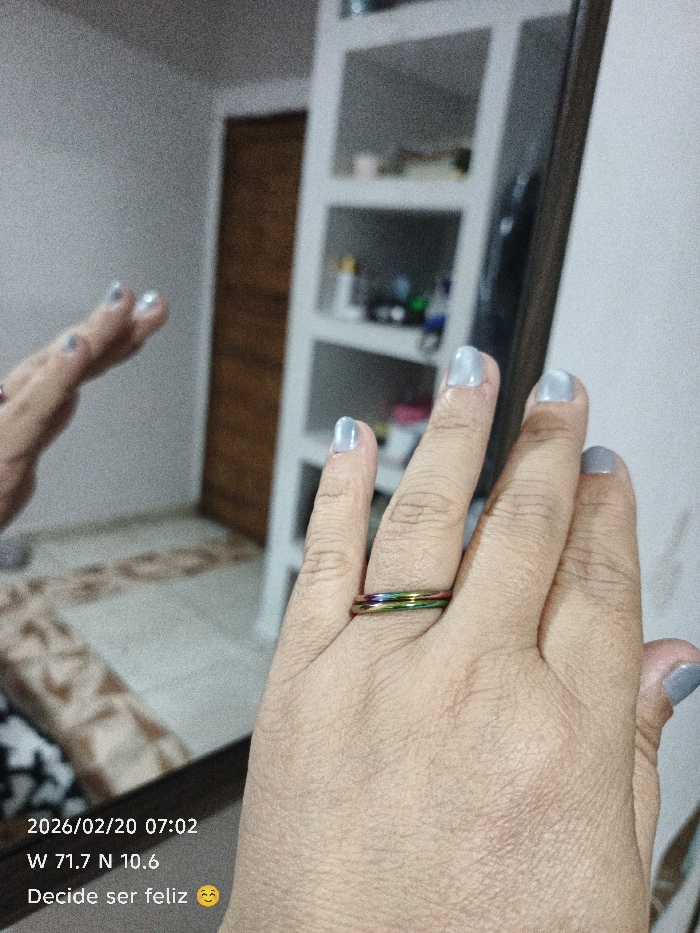 A hand wearing a thin, iridescent ring on the ring finger is prominently displayed. The fingernails are painted a muted gray color. The hand is positioned as if reflected in a mirror. In the background, a blurred room with a wooden door and a white shelving unit is visible. The bottom of the image contains superimposed text indicating a date and time (2026/02/20 07:02) and coordinates (W 71.7 N 10.6) with a message “Decide ser feliz” followed by a smiley face emoji.