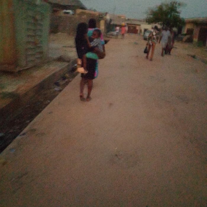 A woman stands on a street carrying a child. Other figures walk further down the street, including some adults, and a child with a hat. Buildings are visible on both sides of the road. To the left, there is a concrete channel alongside the street. The scene has a muted, somewhat blurry quality with an overall dusky atmosphere.