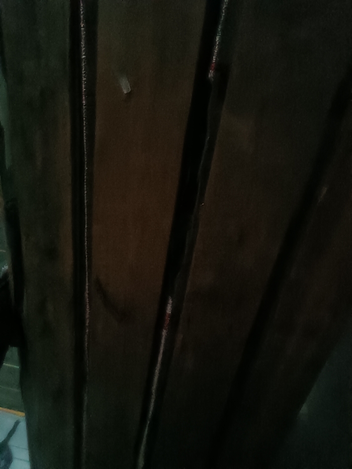 The image captures a dark, textured vertical surface in the city of Unknown, Unknown. The surface is characterized by multiple parallel vertical folds or ridges, consistent with a textile material or paneled structure. The predominant coloration is a very dark brown-black. Along the edges of these folds, subtle, narrow, lighter-colored, and slightly reflective linear highlights are visible. Within the deeper recesses and shadows of the folds, muted reddish-brown and dark green-black undertones are discernible. A small, light-colored, elongated rectangular object, approximately 1/20th the height of the image, is affixed to or resting on the surface. This object is positioned in the upper-central portion of the frame, slightly to the left of the image's vertical centerline. The overall scene is dimly illuminated, with no clear light source apparent. No individuals, specific actions, interactions, or additional distinct objects or contextual elements are present within the visible frame.