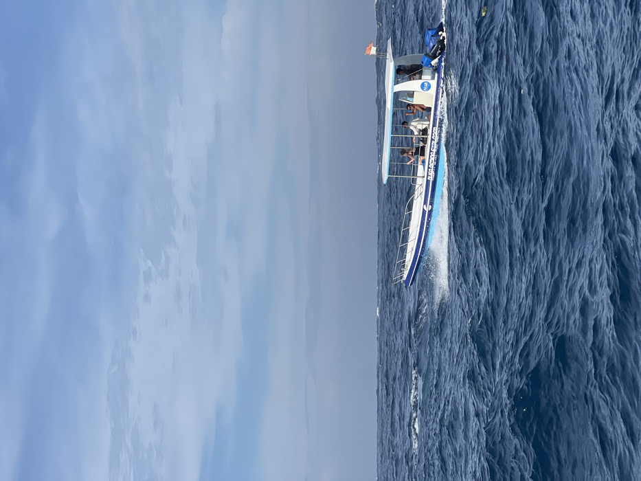A long, narrow, open-air boat cuts through choppy, dark blue water under a partly cloudy, light blue sky. The boat has a white roof supported by metal bars and is filled with people. It has blue accents and lettering on the side. White water splashes from the front of the boat as it moves forward. The sky takes up about half the picture, and the water and boat fill the other half.