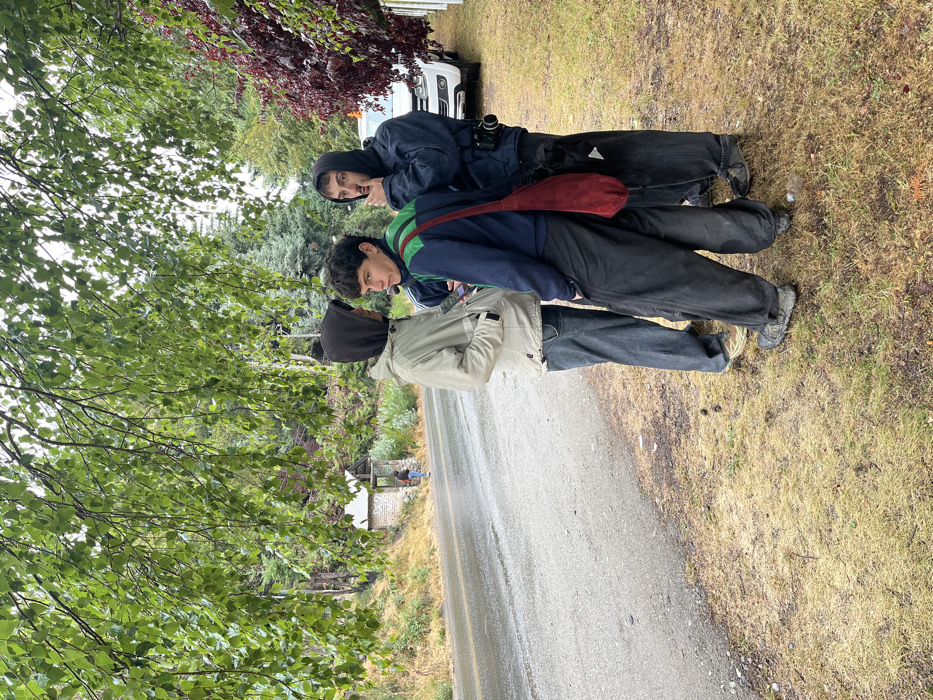 Three people stand on the edge of a road. The person in front wears a light-colored jacket with a hood. Behind, a person in a blue and green jacket looks towards the camera. A red bag hangs across their shoulder. At the back, the third person wears a dark hooded jacket. They are near a white van. The background includes trees, a road, and a grassy area. The road shows signs of moisture.