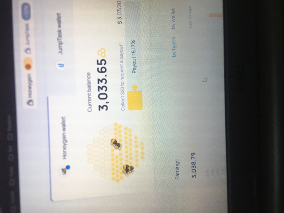 The image displays a computer screen, likely a laptop, showing a digital interface for what appears to be an earning or cryptocurrency platform. The screen content indicates "Honeygain wallet" and "JumpTask wallet" options. A prominent "Current balance" of "3,033.65" is displayed. Below this, a message reads, "Collect $20 to request a payout!" with a progress bar indicating "$3.03/20" and "Payout 15.17%." On the left side of the interface, a honeycomb graphic with two stylized bee icons is visible. Further down, "Earnings" are listed as "3,038.79." A mouse cursor is visible on the screen, positioned in the lower right quadrant. The physical location within Katcha, Nigeria, cannot be determined from the visual information provided in the image. No individuals or specific external environmental details are discernible.