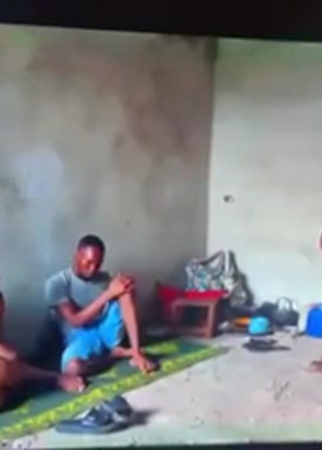 In an indoor scene, presumably a home, two individuals, a woman and a man, sit on a green and gold mat against a roughly plastered wall. The woman is seated with her legs crossed, resting her head on her hand, appearing contemplative or bored. The man sits beside her, nursing his leg with both hands. He is barefoot, with a black sandal lying next to the mat. A second woman, wearing a bright red floral dress, stands near an open doorway. She is holding a striped bag and looking in the direction of the seated pair. The room's decor is sparse, with a small stool and assorted household items scattered in the background, including a blue jerrycan and yellow bucket. The room is dimly lit, with natural light filtering in, casting shadows on the walls.
