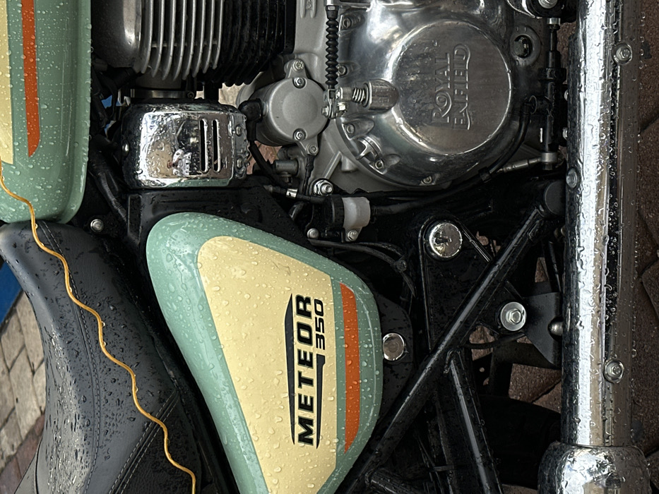 A close-up showcases parts of a Royal Enfield Meteor 350 motorcycle