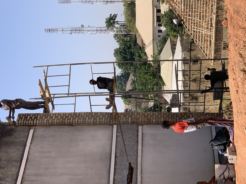 The image depicts an active construction site in Jos, Nigeria, under a clear blue sky