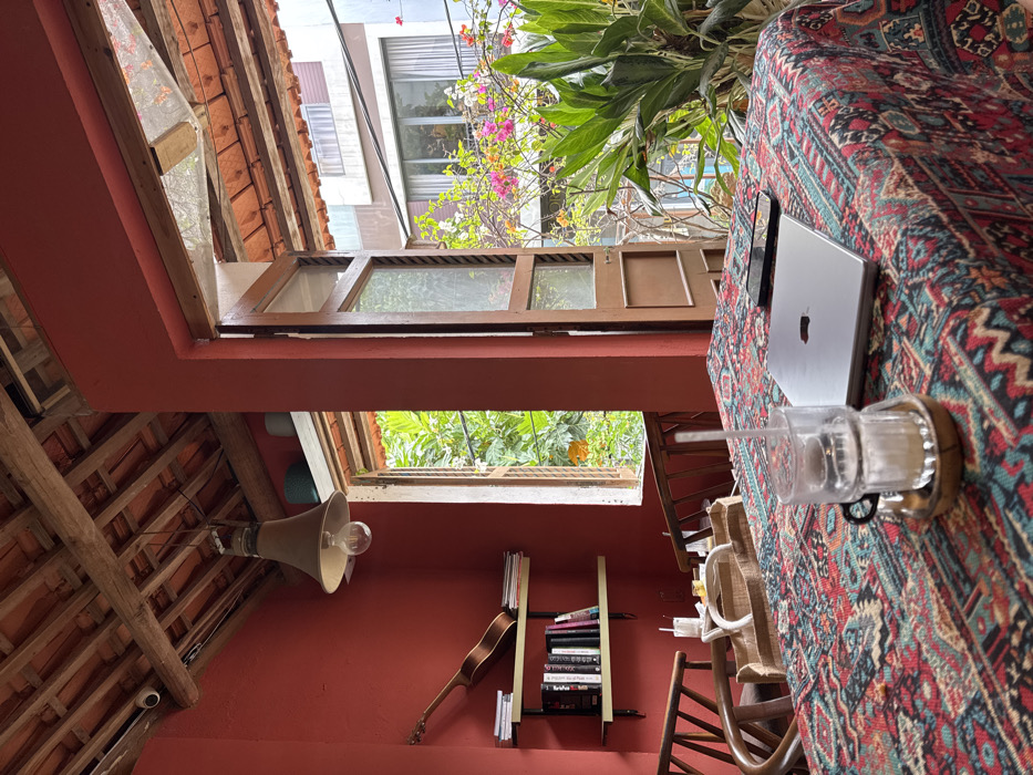 The image depicts an indoor setting, likely a cafe or workspace, located in An Hải Ward, Vietnam. The room features reddish-orange painted walls and an exposed wooden beam ceiling with visible clay roof tiles. In the foreground, a table covered with a multi-colored patterned tablecloth displays a closed silver-colored laptop and a dark-colored smartphone. A clear glass containing a light-colored beverage with a white straw rests on a wooden coaster next to the laptop. To the left, two light-colored floating shelves are mounted on the wall. The upper shelf holds a stack of books and an acoustic guitar leaning against the wall. The lower shelf contains more books. A wooden chair with a slatted back is partially visible, with a woven straw bag draped over it. Behind this, another glass with a straw and a small plate of food items are visible on an adjacent surface. A bell-shaped pendant lamp with an exposed bulb hangs from the ceiling. Multiple openings provide views to the exterior. An open wooden window on the left reveals lush green foliage. To the right, an open wooden door or large window leads to an outdoor space with large green plants and vibrant pink, white, and yellow flowers, primarily bougainvillea. Beyond the foliage, multi-story residential buildings with windows are visible under a bright sky, indicating an urban environment. No individuals are present in the frame.