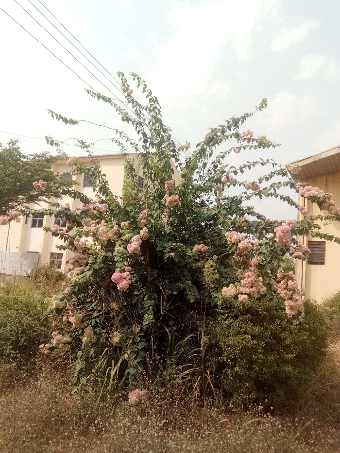 The image displays an outdoor scene in Nsukka, Nigeria, featuring a large, flowering shrub dominating the foreground and midground