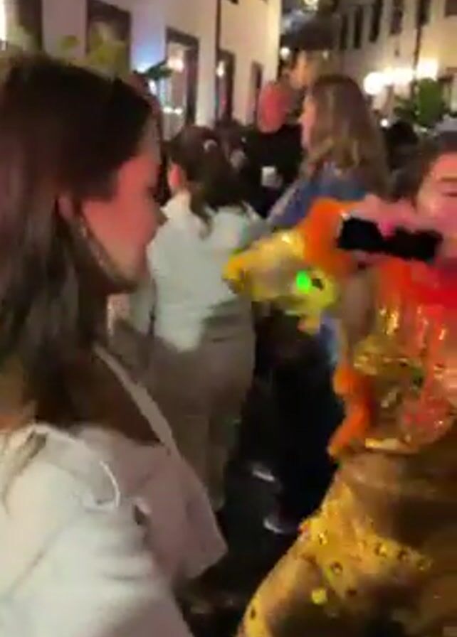 group of people dancing in the street at night. Some of the dancers are wearing brightly colored costumes with feathers. The street is narrow and lined with buildings. The lighting is provided by streetlights and spotlights. A woman in a white shirt grabs one of the feather head pieces to try on.