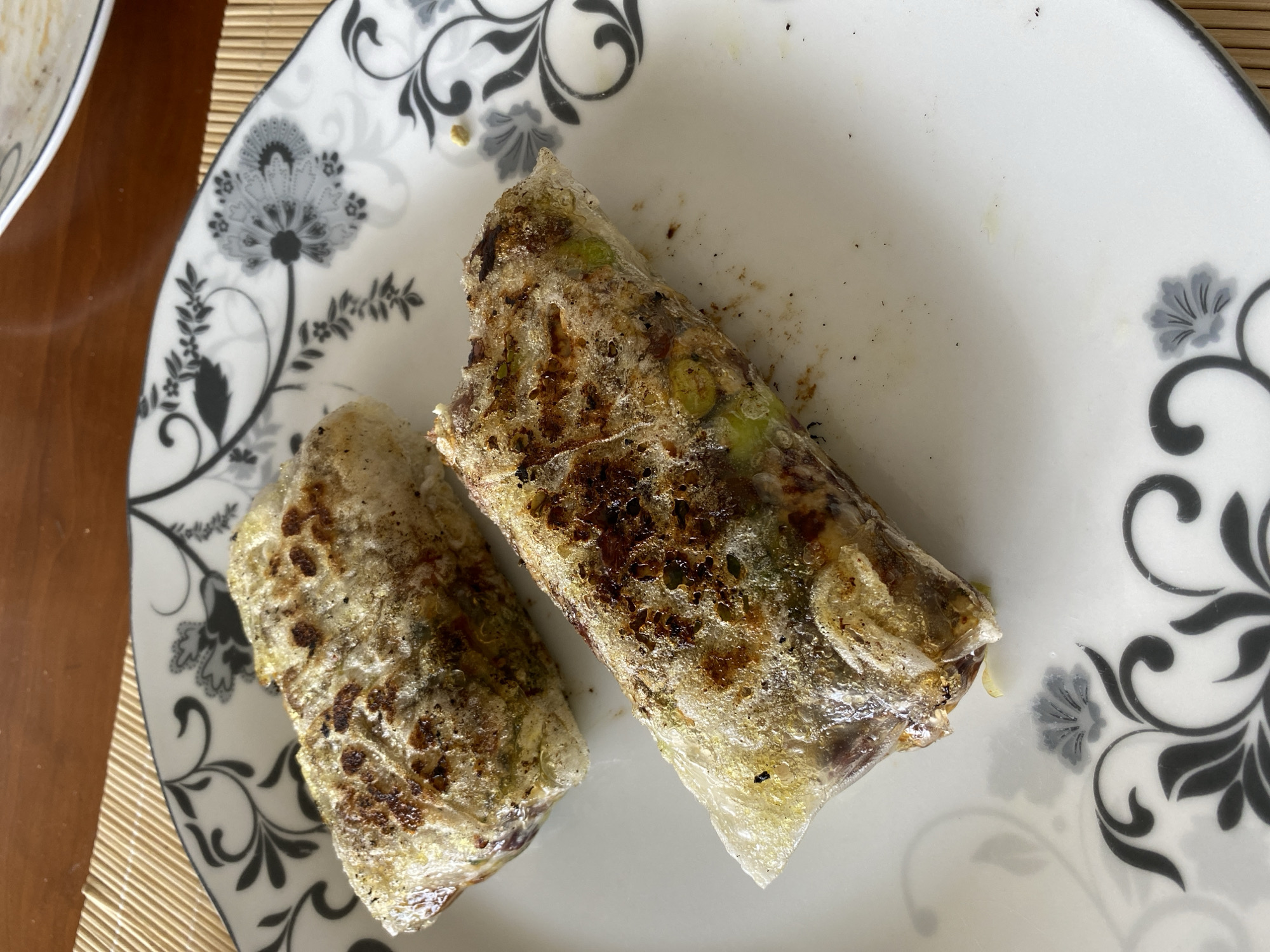 - "Two fried spring rolls are arranged on a white plate with a black and gray floral pattern" by FM-whkRu1, licensed under CC BY 4.0