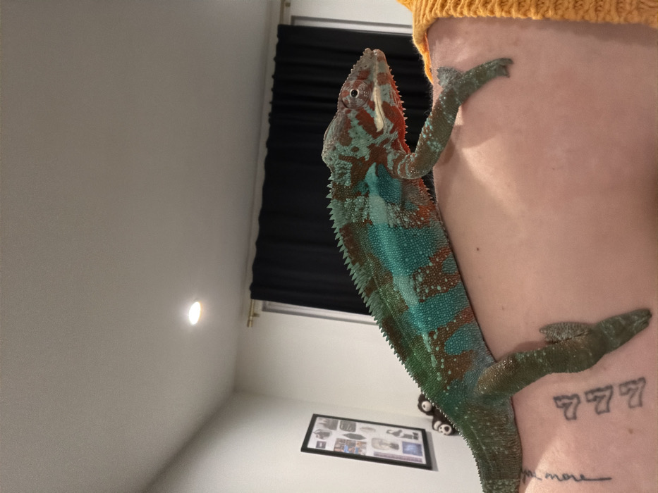 A chameleon clings to a person's shoulder, its vibrant turquoise and red scales contrasting against the skin. The person wears a mustard-yellow knit top. The chameleon's feet grip tightly. In the background, a black window shade hangs above a framed picture on a white wall. A small light fixture illuminates the ceiling. A tattoo of "777" and part of another tattoo are visible on the person's skin.