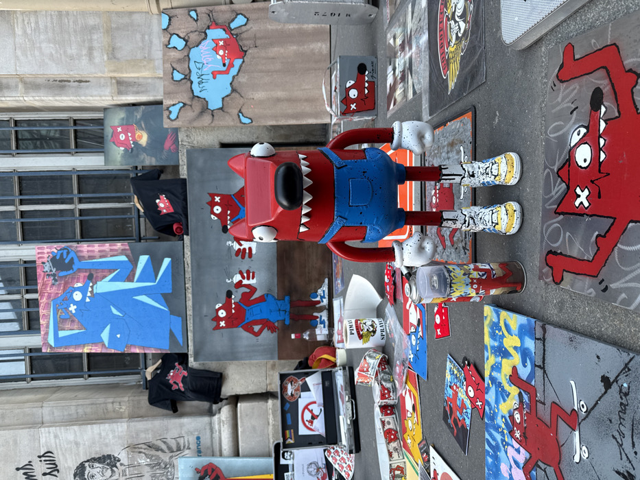 An outdoor art display is set against the classical stone facade of a building in Paris, France. The scene features a collection of artworks and merchandise centered around a distinctive red, anthropomorphic, dog-like character with sharp teeth and "X" eyes, often depicted in blue overalls. In the foreground, a large, approximately three-foot-tall, red sculpture of this character stands upright, wearing blue overalls and custom white and yellow sneakers. Surrounding it on the paved ground are numerous flat artworks, including depictions of the character skateboarding and in graffiti-style settings. Several spray paint cans, one decorated with the character, are also on the ground. Behind the sculpture, larger canvases and panels are propped against the building, showcasing the red character interacting with spray cans, breaking through a stylized wall, and superimposed on a classical portrait resembling the Mona Lisa. Another large blue canvas depicts a multi-limbed blue creature. Two black t-shirts featuring the character hang from a rail. To the left, an open silver briefcase displays various stickers and a laptop. The laptop screen shows a person wearing a mask depicting the red character. A white mug, bearing the text "PIMAX SPRAYER," is visible nearby, along with rolls of tape featuring the character. A black and white portrait drawing is affixed to a stone pillar on the far left, with faint French text underneath. To the far right, a small grey box also features the character's head and the name "Pimax." The display is illuminated by daylight, casting shadows on the paved ground. The background architecture consists of a large, light-colored stone building with tall, multi-paned windows featuring dark frames and vertical bars.