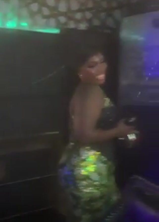 woman in a sparkly green-and-black dress in a nightclub. She’s smiling and looking towards the left of the frame. The club is dimly lit with purple and blue lights. The name “Nucleus” is visible on the wall. There are club chairs in the foreground. Someone in a pink outfit can be seen in the background to the left. Loud music is playing.