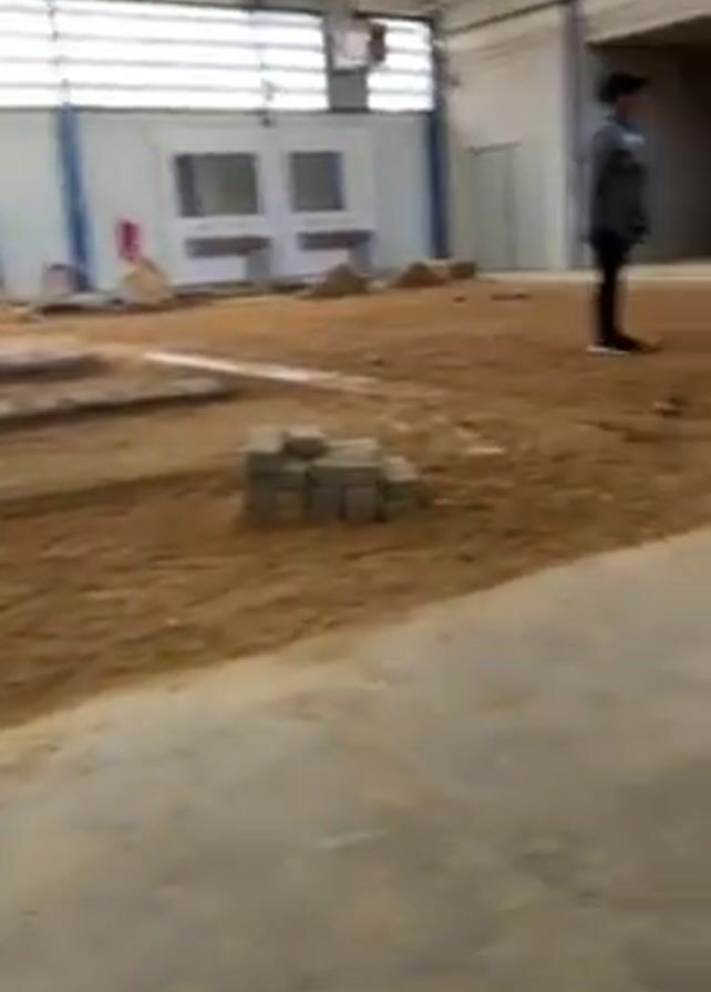 group of people standing around a large pile of sand inside what appears to be a warehouse or large indoor space. The group consists of several individuals, some wearing casual clothing and others in uniforms. There is a large pile of sand in the center of the scene, with construction materials like planks and concrete blocks scattered around it. The background reveals warehouse doors and windows, as well as metal shelves and a red door. The group seems to be engaged in a conversation or observing something within the sand pit, as they are focused on the central area.