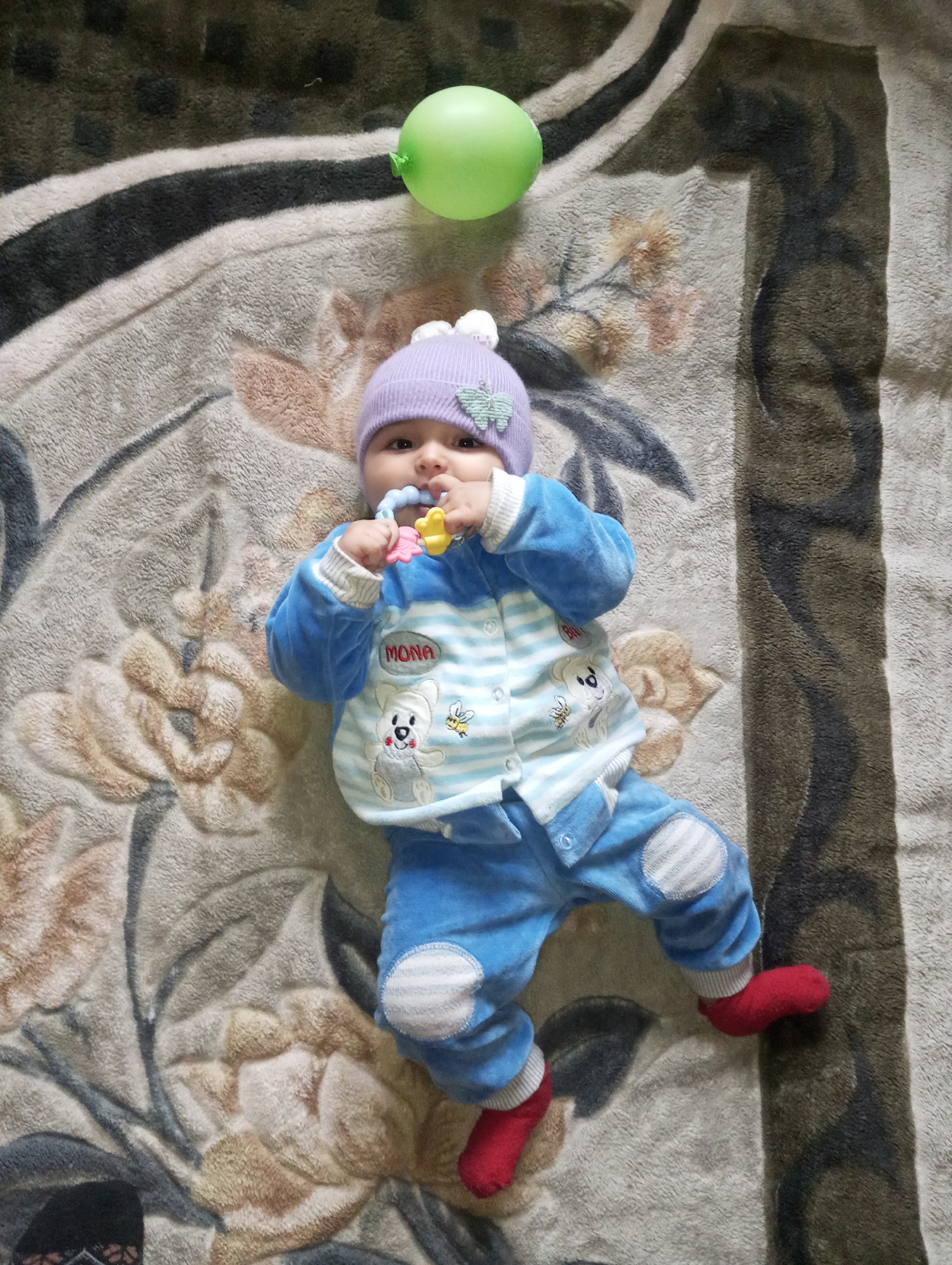 A baby is observed lying supine on a patterned blanket or rug. The baby wears a light purple beanie with white pom-poms and a green butterfly embellishment, a blue and white striped top featuring "MONA" text and a cartoon bear with a bee, blue pants with striped knee patches, and red socks. The baby is holding a multi-colored teether (blue, pink, yellow components) in its mouth. A green balloon is partially visible in the upper left corner of the frame. The blanket/rug displays a textured floral and striped pattern in shades of beige, brown, and dark grey. This scene is located in Galaosiyo, Uzbekistan.