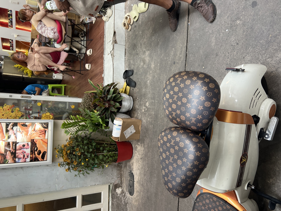 The scene depicts a street view in an unspecified location within Thủ Đức, Vietnam, outside a commercial establishment, likely a spa or massage parlor. In the immediate foreground, a white and orange electric scooter is parked on a concrete pavement. Its two distinct seat cushions are dark brown with a repeating light brown Louis Vuitton monogram pattern. An 'LV' emblem is also present on the scooter's side. On the concrete pavement in front of the establishment, a brown cardboard box containing various items rests next to three potted plants: a red pot holding a tall plant with small yellow flowers, and two white pots with green foliage plants. Near the entrance, five pairs of assorted footwear are on the ground: a pair of black flip-flops, two pairs of white/cream slide sandals, a pair of light brown children's sandals, and a pair of light green slide sandals. The lower legs and feet of a person wearing dark brown Adidas athletic shoes are visible on the far right of the frame, standing on the pavement. The establishment's exterior features a glass entrance door. To the left of the door, a vertical, illuminated sign displays six photographic images depicting various spa and massage services, including hot stone therapy on feet and a back massage. Yellow floral decorations are visible through the glass door near the entrance. Inside the well-lit establishment, which has a dark wood laminate floor, three individuals are present. A man wearing a blue t-shirt and dark pants is partially visible, seated on a green plastic stool further back. Closer to the entrance, two women are seated on dark stools. The woman on the left, with long reddish-brown hair, is wearing a light beige long-sleeved top and dark shorts. She is barefoot, has her legs crossed, and is looking towards her left while holding a smartphone. Her white slide sandals are positioned on the floor beneath her. The woman on the right, with her hair tied back, is wearing a light-colored striped outfit. She is barefoot, seated with one leg bent, and holding a small bottle or container.