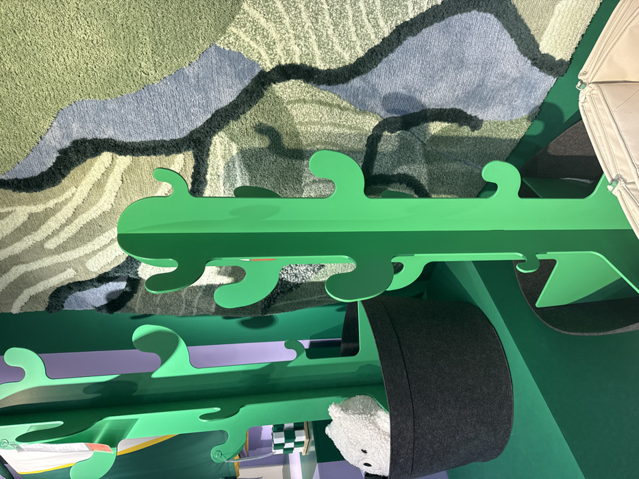 The image captures an interior showroom scene, consistent with an IKEA store display in Sofia, Bulgaria. The primary subjects are two bright green, Saguaro cactus-shaped clothes stands. One stand is positioned prominently in the mid-ground, slightly right of center, showcasing multiple hooks. A second identical stand is partially visible in the background, positioned to the left. A dark grey, cylindrical felt storage basket containing a white, plush, animal-shaped toy rests on a dark green surface behind the left stand. Further left, a green and white checkered pattern is visible on a raised platform. The background features a large, textured rug or textile wall hanging with an abstract, organic pattern in shades of light green, beige, and light blue-grey, accentuated by dark grey or black outlines. The overall environment is brightly lit, casting shadows on the floor and wall hanging. No individuals are present within the frame.