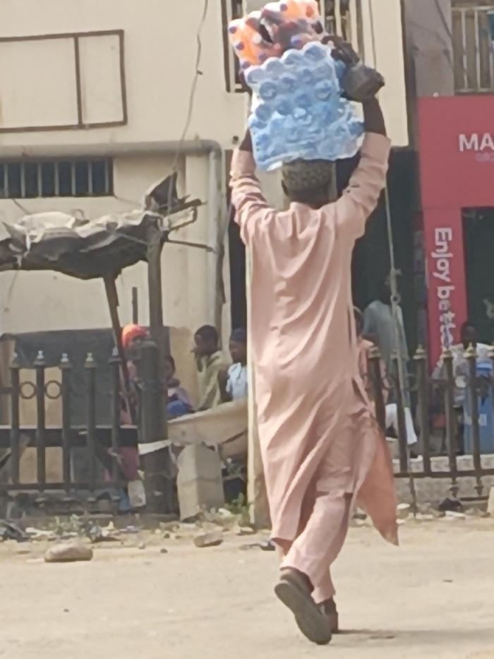 In Fagge A, Nigeria, a male individual is depicted walking away from the viewer on an unpaved, dusty path. He wears a light-colored, long-sleeved tunic over trousers and a patterned cap. Both arms are raised to stabilize a load carried on his head, consisting of two distinct bundles of plastic bottles. The lower bundle contains bottles with light blue contents/caps, while the upper bundle contains bottles with orange/red contents/caps, topped by a dark, amorphous object. To the left, a makeshift shaded structure with a corrugated roof is supported by wooden poles, partially obscuring a dark metal fence. Behind this fence and structure, several individuals, including children, are partially visible. To the right, a vertical red sign displays partial white text, including "Enjoy bett" and "MA." Light-colored buildings are visible in the background. The scene is illuminated by bright daylight.