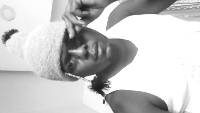 The image displays a black and white, chest-up portrait of an adult male, taken indoors in Sabon Tasha, Nigeria. The individual has dark skin and is looking directly at the camera. He is wearing a light-colored, possibly white, sleeveless tank top. On his head, he wears a light-colored, textured beanie hat with a pom-pom on top and two braided strings, each terminating in a small pom-pom, hanging down the sides; one is visible on the left. His right hand is raised, with fingers partially obscuring his right eye. The background is predominantly light-colored. A circular recessed light fixture is visible on the ceiling in the upper right quadrant of the frame. A vertical, patterned object, possibly a curtain, is partially visible along the far right edge of the image.
