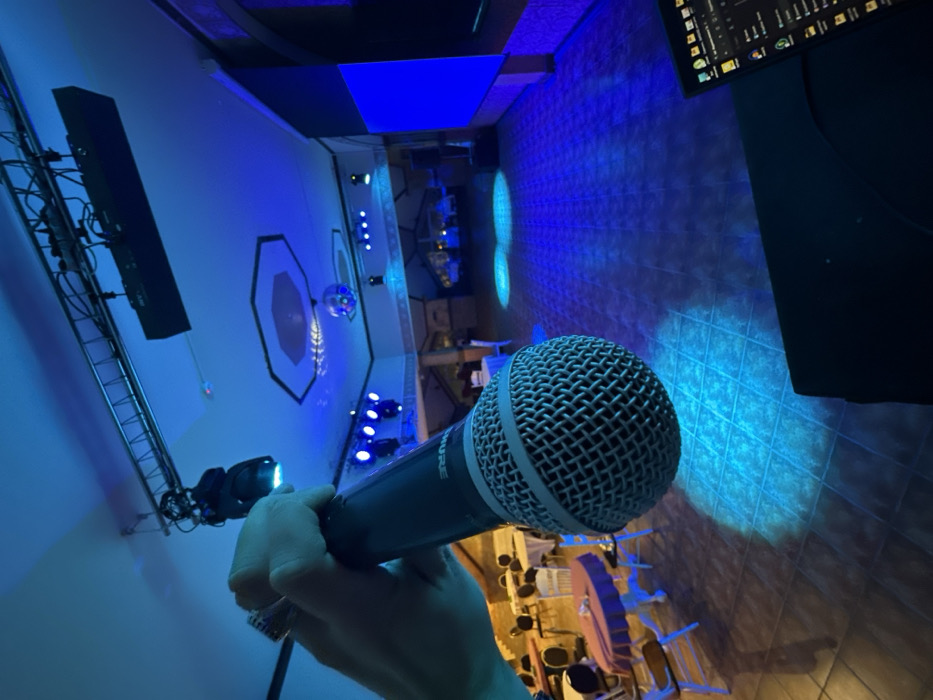 A person holds a Shure microphone in a blue-lit venue. A stage with hexagonal decor, a disco ball, and stage lights adorn the background. A light rig hangs on the left wall. The right wall shows a screen with software and a speaker. Below the microphone, tables with pink tablecloths and chairs are seen. The flooring has a textured pattern and blue light spots. The overall ambience is of a concert or event venue.
