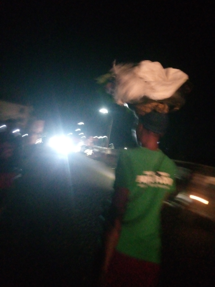 A person walks along a dark road at night. They are carrying a bundle, possibly laundry, on their head. The person is wearing a green shirt. Bright headlights and blurred streetlights are visible in the background, suggesting vehicular traffic. The overall image is poorly lit and blurry, possibly taken while in motion.