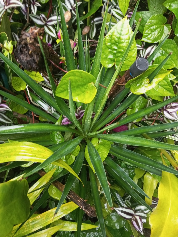 A dense grouping of plants in varying shades of green and yellow. Long, spiky leaves radiate from the center, surrounded by heart-shaped leaves. Zebra plants with stripes of white, green, and purple add visual texture. A piece of dark wood and a cylindrical gray object are partially visible amidst the foliage. The plants appear wet, as if recently rained upon.