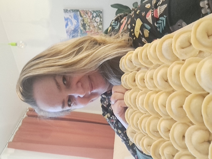 The image displays a Caucasian female subject, appearing middle-aged with long blonde hair, looking directly at the camera with a slight smile. She is wearing a dark, patterned garment and is positioned behind a large, rectangular tray filled with numerous uncooked dumplings, likely pelmeni or vareniki, arranged in uniform rows. Her right hand is visible, resting on the edge of the tray. The immediate background reveals an indoor domestic environment. To the left, a light terracotta-colored curtain hangs from a white rod. To the right, a white wall is visible, featuring a bare light bulb with a neon green base suspended from the ceiling. Below the light fixture, two framed art pieces are mounted on the wall; the left one depicts a mountainous landscape, and the right one illustrates a field of white flowers. A green potted plant is partially visible in the far-right corner. The image depicts an indoor domestic setting; however, no identifiable markers within the image confirm the specific location as Murino, Russia.