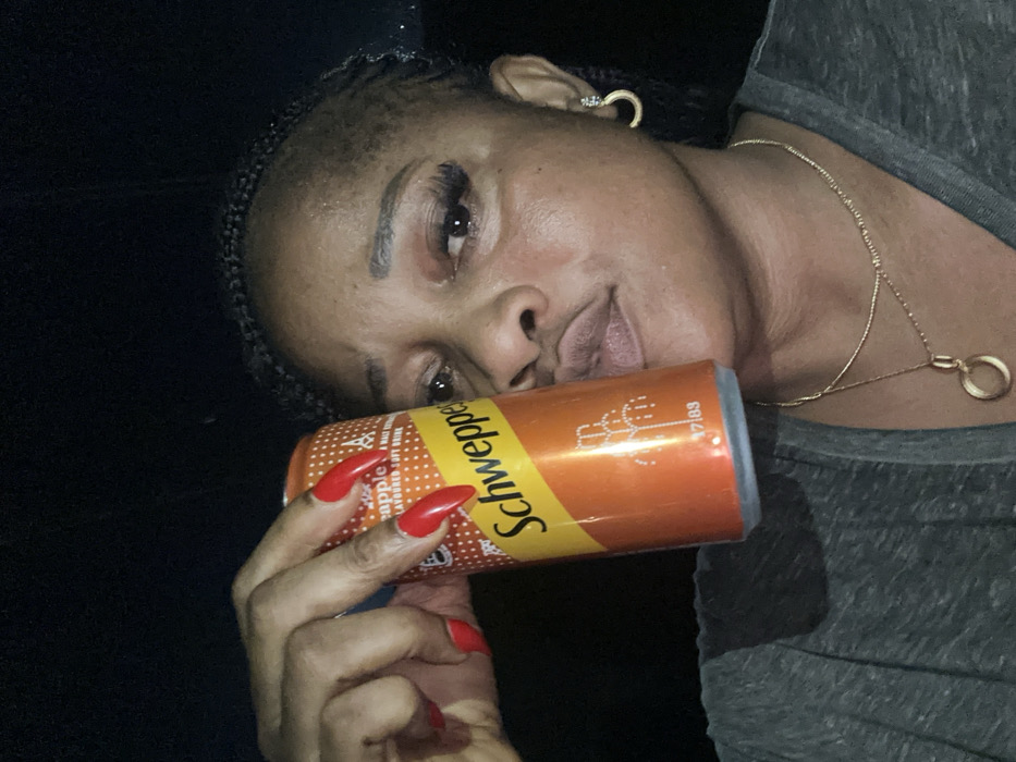 A woman is holding a can of Schweppes pineapple soft drink close to her face. She has long, red, stiletto-shaped fingernails. She is wearing a grey t-shirt and a gold necklace. She has braided hair and gold hoop earrings. Her makeup includes eyeliner and false eyelashes. The background is dark, and the lighting is poor.