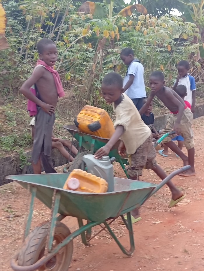 The image depicts an outdoor scene in the city of Isinyi-Nando, Nigeria, situated on an unpaved reddish-brown dirt path. Dense green vegetation, including plants resembling cassava, borders the path in the background. Approximately eight to ten children, primarily young males, are present. In the foreground, a dark-skinned boy, shirtless and wearing dark shorts with a pink cloth draped over his left shoulder, stands with hands on his hips, looking directly towards the viewer. A pink backpack is partially visible on his back. Immediately in front of him, a green wheelbarrow with a single black tire contains a grey plastic jerry can and a yellow plastic jerry can with a pink cap. Towards the center of the frame, another dark-skinned boy, wearing a light-colored shirt and patterned shorts, leans over a second green wheelbarrow, appearing to interact with a large yellow plastic jerry can placed within it. To the right of this wheelbarrow, a third dark-skinned boy, shirtless and wearing light shorts with a red waistband and light green flip-flops, stands facing partially left. Several other children are partially visible in the mid-ground and background; one boy wears a white collared shirt and blue shorts, and another is in a white t-shirt with blue sleeves. The legs of an additional child are visible within a shallow trench running along the left edge of the dirt path. The scene portrays children gathered with wheelbarrows containing multiple plastic liquid containers.