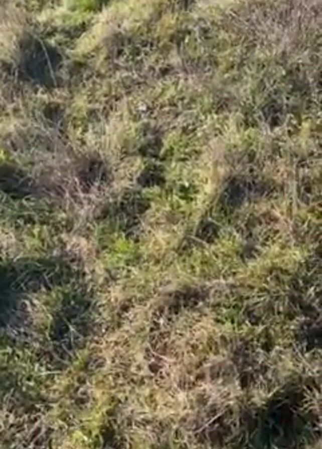 grass-covered slope that reveals a view of a town in the distance. The grass is patchy, with some areas being green and others brown. The camera moves slightly upward, revealing more of the town in the background, which is situated in a valley. The sky above is clear and blue.