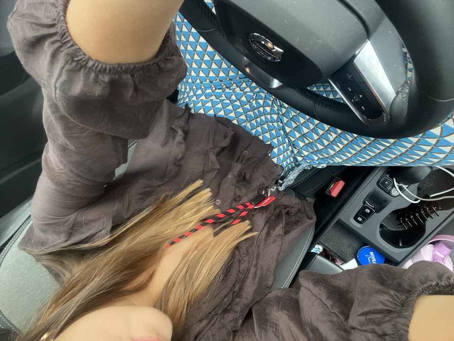 The image depicts a partial view of an individual seated in the interior of a vehicle, consistent with the driver or front passenger seat, in what is contextually specified as Carnaxide, Portugal. The subject, a female, has fair skin, visible from the lower left portion of her face with pink-tinted lips. Her long, straight hair, which is light brown to blonde, extends across her chest. She wears a dark brown, long-sleeved, collared shirt made of a textured or ruffled fabric, with elasticized cuffs. Below the shirt, a garment with a repetitive geometric pattern of blue and white triangles is visible. Around her neck or draped over her chest is a red and black striped lanyard with a silver-colored clip, to which a small red tag is attached. The vehicle's interior features a grey upholstered seat on the left. To the right, a black steering wheel with silver accents and control buttons is partially visible. The center console includes cup holders, one containing a blue Nivea tin. Other items on the console include a black comb, a white charging cable connected to a port, and several black buttons and switches. A red seatbelt buckle is also visible. The overall scene is well-lit, suggesting daytime conditions.