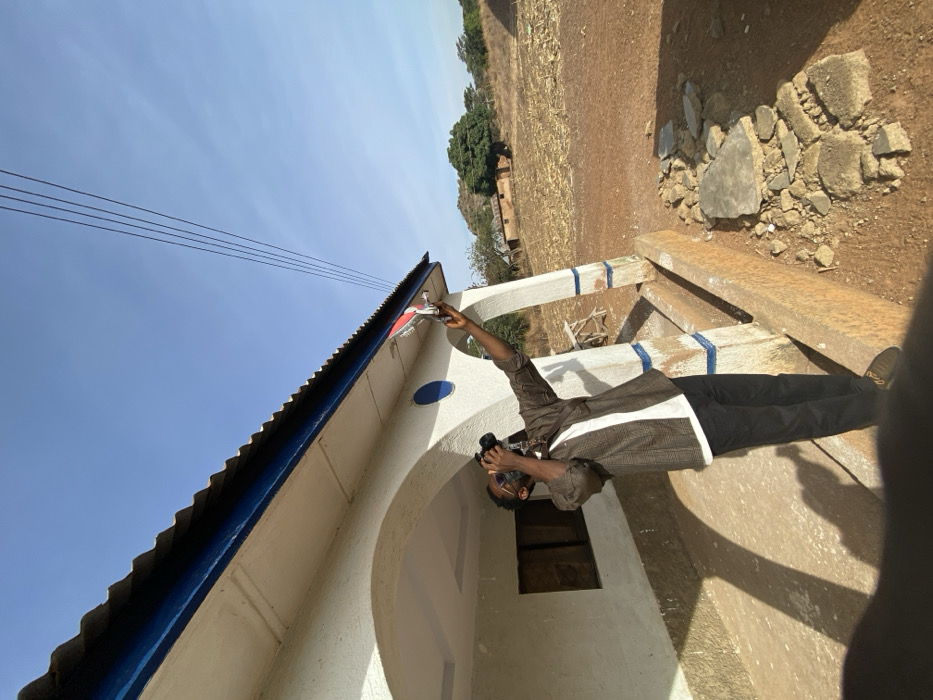 A man wearing black pants and a brown shirt stands on a concrete structure, holding a camera and pointing to the roof of a nearby building. The building is white with a blue roof, blue accents, and a small window. Power lines stretch across the blue sky above the building. In the background, there is a dirt ground and some sparse green foliage.
