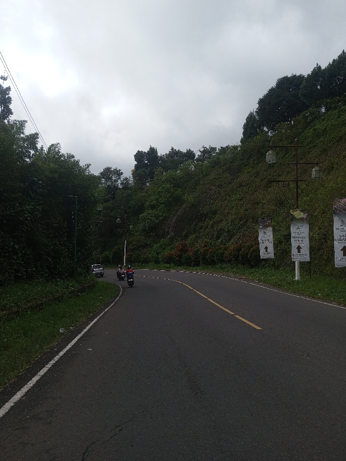 A winding asphalt road curves through a lush, green landscape under an overcast sky. A yellow line marks the road's center. Several scooters ride on the road, followed by a car in the distance. Vegetation covers a slope on the right, dotted with vintage-style lampposts and promotional banners. Trees and greenery line the left side of the road. Overhead cables stretch across the scene.