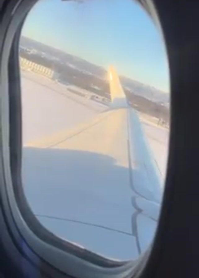 The view from an airplane window shows a white wing against a snowy landscape